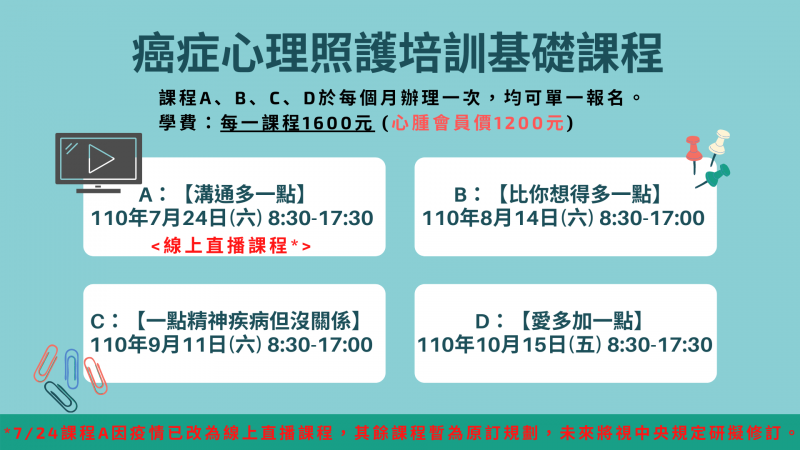 報名(請同步完成繳費): ※7/24課程A因疫情已改為線上直播課程,其餘課程暫為原訂規劃,未來將視中央規定研擬修訂。 ※(每課程評估)因疫情嚴峻將先調查報名學員意願而研擬『線上直播課程』開課,因應教育積分申請單位要求,學員需配合1.各堂課程簽到、簽退紀錄。2.課後評核。完整出席且考試合格(60分)者即可核發電子時數證明。